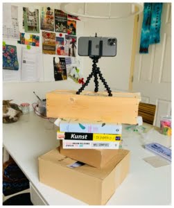 Tijdens dit oefen filmpje heb ik met behulp van provisorische hulpmiddelen mijzelf gefilmd. Zo heb ik ondervonden dat het stapelen met dozen voor de juiste hoogte van de camera een beetje lastig is en dat een uitschuifbaar statief noodzakelijk is. Vooral buiten werken dozen en boeken niet echt.