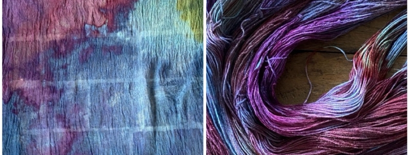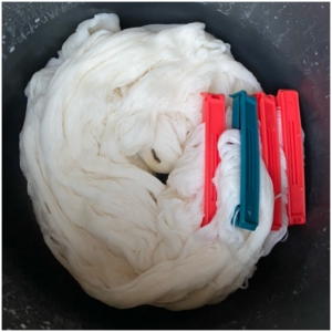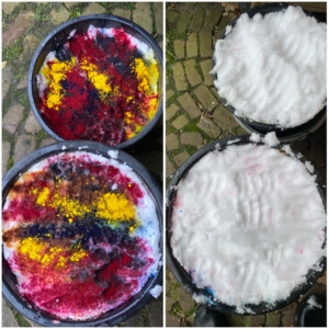 Nadat de sneeuw is gesmolten, gaan de strengen en de lappen in de oven voor het fixeren van de verf. Na een uurtje op 75 graden denk ik dat het wel goed genoeg is en ga ik spoelen. Dat vindt ik het vervelendste karwei, maar het is meer dan de moeite waard. Ik ben super tevreden met het resultaat. Ben je nu door mijn enthousiasme ook geïnspireerd? Neem dan een kijkje op het blog van Verfvirus, daar staat alles over verven met sneeuw zelfs met een handig YouTube filmpje.