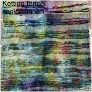 Heel verrassend is het effect van verven met sneeuw op de verschillende materialen. Tencel (een kunstmatige vezel op natuurlijk basis, de grondstof van de vezel is houtpulp) verft heel goed, maar in de geweven lap met een ketting van tencel en een inslag van linnen neemt het linnen alle verf op doet het tencel niets. 😅