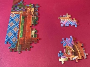 De Sint bracht mij een quiltpuzzel, dat had ik hem wel ingefluisterd, en voor de zekerheid ook de link doorgestuurd waarmee de puzzel besteld kon worden, hij is tenslotte ook de jongste niet meer. Heerlijk puzzelen, 1000 stukjes. Het hield me uit de slaap, want nog even een paar stukjes aanleggen loopt vaak uit. Wat erg leuk was: je herkent de quiltblokken op de puzzel, omdat je ze ooit zelf maakte of gezien hebt. Het betrof traditionele blokken, gemaakt door grijze dames met katten in de werkruimte: herkenbaar! Binnen de week was de puzzel klaar.