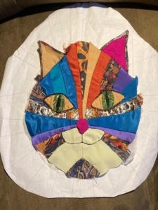 Na passen en meten, tekenen en gummen heb ik een kussentje ontworpen met de kattenkop erop.