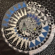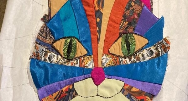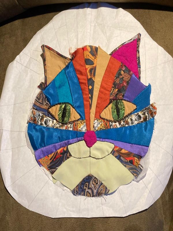 Ik heb nog een grote voorraad theezakjespapier, maar nul ervaring met paperpiecing. (die kleine log-cabins tel ik even niet mee). Dus een quiltvriendin geraadpleegd, die me weer wijst op een te downloaden boekje van Maaike Bakker. Ik ben te ongeduldig om het helemaal te lezen en besluit de kat in vier stukken te verdelen, en zelf een werkvolgorde te bedenken. Met vallen en opstaan puzzel ik de kattenkop in elkaar , ook dit weer ten koste van wat nachtrust. Na nieuwjaar naaide ik de 4 delen aan elkaar en ziedaar…