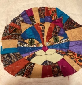 Tja, en dan met zijde aan het werk: glad, glibberig, rafelend…. waar begin ik aan! Dit vraagt om een ondergrond: paperpiecing.