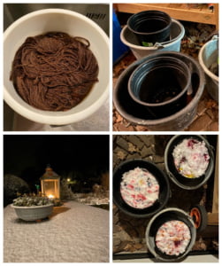 Dit keer wil ik experimenteren met jute touw. Dat betekent van het touw ,waarvan ik gelukkig nog genoeg heb liggen, hanteerbare strengen maken. De oude emmers en de bloempotten die er goed in kunnen staan opzoeken en ook nog even voor soda en zout op de fiets naar het dorp. De strengen week ik voor in een Soda Ash (soda en zout) oplossing en dan begint het turen op de buienradar, het wachten is op de sneeuw. De voorspelde 4 tot 6 cm sneeuw haalt het bij lange niet, maar rond de klok van 24.00 uur heb ik net voldoende sneeuw om aan de slag te gaan.
