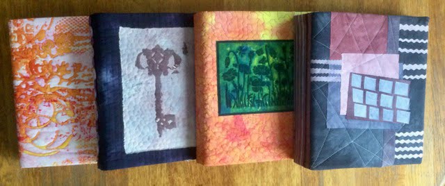 Alle dagboekjes gaan in een map met 4 ringen, zodat het een mooie verzameling is van technieken en gebeurtenissen. Natuurlijk bekleed ik de mappen met mijn eigen geverfde stof.