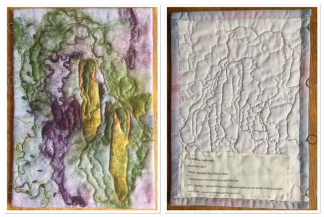 December 2017 maakte ik mijn allereerste dagboek van stof. Een techniek, waarmee Hannie de Beer en ik samen een middag hebben gespeeld. In het jaar 2018 heb ik ook iedere maand met een andere techniek een dagboek gemaakt. Nu heb ik een mooie map vol inspiratie!