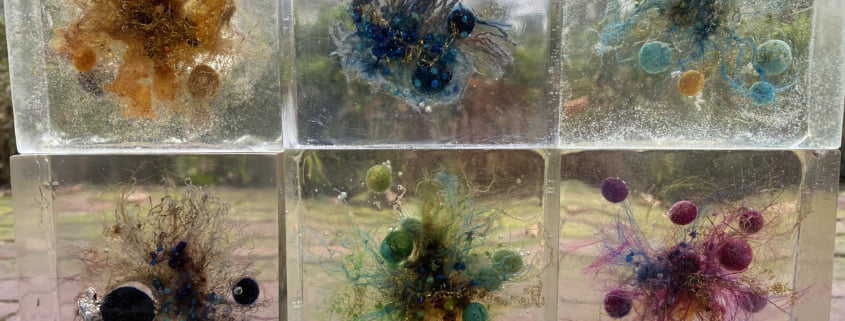 De werktitel van mijn kleine werkjes is ‘Gevangen landschap’. Het zijn kleine landschapjes die opgesloten zitten in epoxy. Ik wil hiermee uitdrukking brengen hoe de mensheid onze aarde belast en daardoor het klimaat.