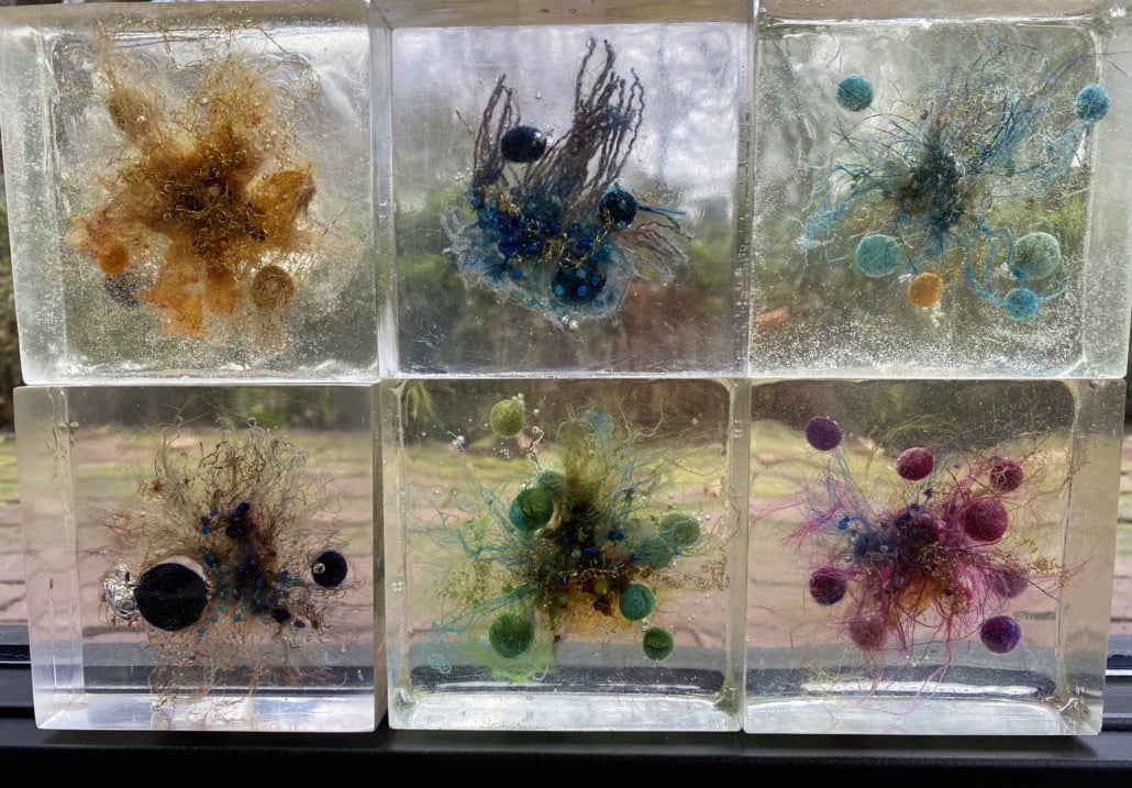 De werktitel van mijn kleine werkjes is ‘Gevangen landschap’. Het zijn kleine landschapjes die opgesloten zitten in epoxy. Ik wil hiermee uitdrukking brengen hoe de mensheid onze aarde belast en daardoor het klimaat.