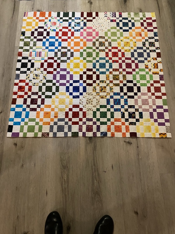 Er ligt een top van 75 blokken, gedubbeld klaar, deze kan gequilt worden. Deze quilt was naar aanleiding van de uitdaging 100 blokken van Tula Pink maar dan achterstevoren gemaakt. Ik doe mee aan de Round Robin van het Modern Quilten. Ik heb nu een blok liggen waar ik zelf een rand bij moet verzinnen en maken. Als dit klaar is, wordt dit blok met rand doorgegeven aan de volgende uit onze groep. Zo krijg je uiteindelijk je eigen blok terug met 4 randen eromheen door verschillende quiltsters gemaakt. De uitdaging hierbij vind ik toch wel om in het moderne te blijven. Volgens mij zie je niet zoveel moderne quilts met aparte randen.