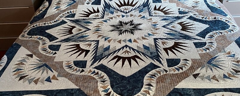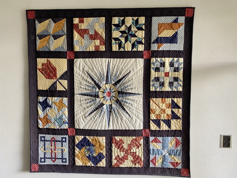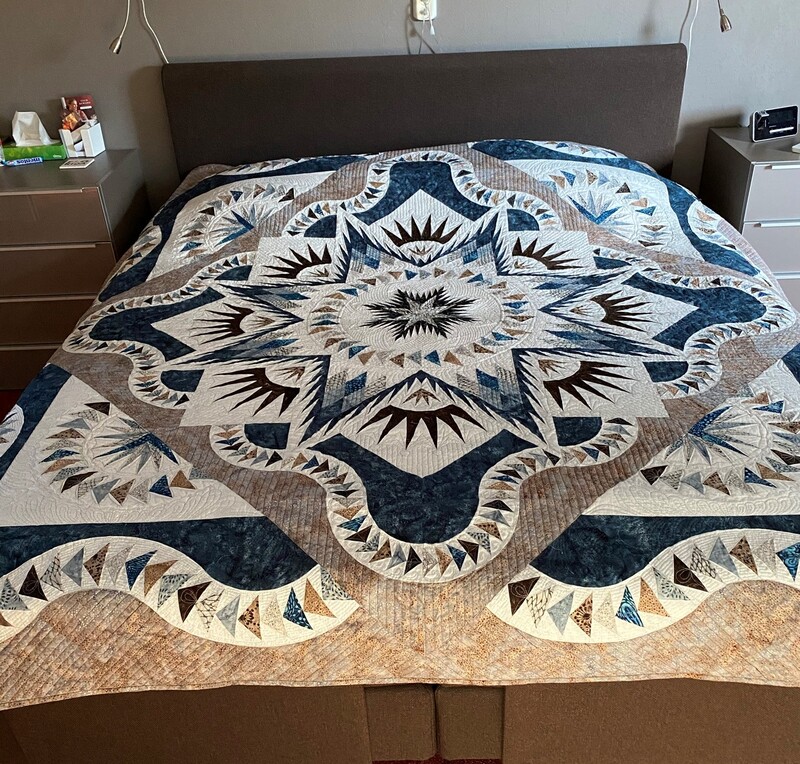 Dat is er niet één. Ik heb een bed quilt gemaakt naar het patroon van Judith Niemeyer en daar ben ik erg trots op. Dit soort ingewikkelde quilts zie je vaak voorbij komen en ik heb altijd gedacht “wat bijzonder als je er zo een kunt maken”. Nou het is mij gelukt en wat ook bijzonder is, ik heb hem op mijn gewone naaimachine gequilt uit de vrije hand, 2.40 meter bij 2.40 meter.