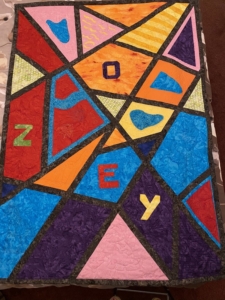 En een quilt voor mijn kleindochter. Zij heeft in het begin van de Coronatijd een stoepkrijttekening gemaakt. Deze heb ik nagetekend en uitgewerkt in een quilt. Voorzien van een lekker zachte achterkant en doorgequilt met dierpatronen. Ze is er zo blij mee dat ze nu voor oma een schilderij heeft gemaakt met, jawel, de quilt als onderwerp.