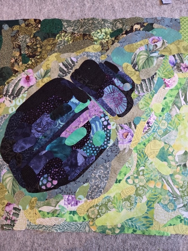Oh, en ik ben ook bezig met een quiltje voor de volgende uitdaging van de EQA, de wondere wereld van insecten. Ik heb een kever gemaakt met de collage techniek, daar heb ik verschillende kleuren tule overheen genaaid en die heb ik machinaal doorgequilt. Nu ben ik aan het bedenken hoe ik de details verder ga borduren. Want daar kan ik de techniek die ik heb geleerd van Fanny weer goed voor toepassen.