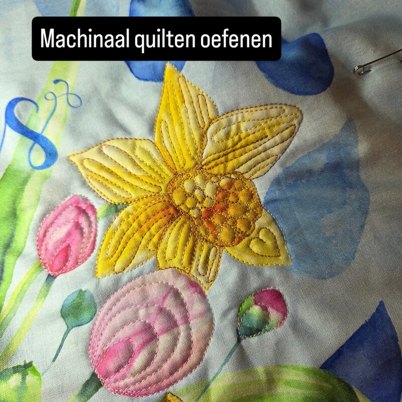 Ik heb ook een vrolijk panel met bloemen en een gieter liggen. Die gebruik ik om het machinaal quilten mee te oefenen.