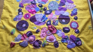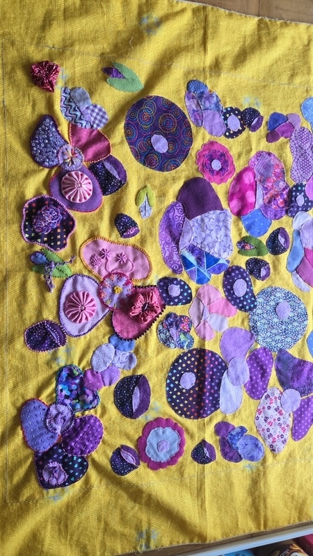 Zoals zo veel quilters heb ik meerder projecten tegelijkertijd liggen. Ik ben op dit moment bezig met de Poppyfield van Fanny Eikelenboom. Ik maak ‘m op een gele achtergrond met paarse en roze bloemen. Ik heb nu alle bloemen op de achtergrond geappliqueerd en ben bezig met het borduren van de bloemen. Ik heb alles in felle kleuren en probeer zoveel mogelijk te borduren en iedere bloem van allemaal verschillende steken te voorzien. En kraaltjes! Ik ben net een ekster…