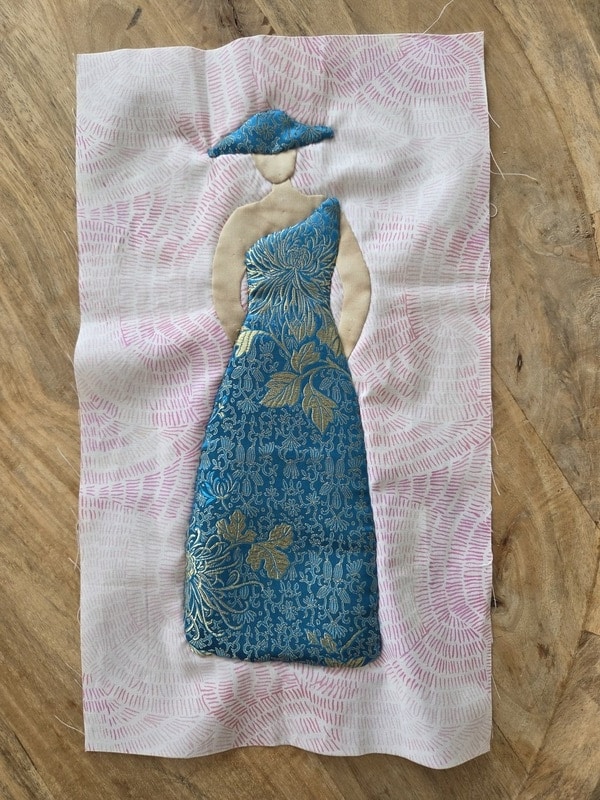 Ik ben ook begonnen aan de nieuwste uitdaging van Wendy Vosters. Allemaal dames in feestjurken. Ik heb het eerste blok gemaakt met een jurk in blauwe zijde. Doe stof heeft mijn moeder ooit uit China meegenomen. Dat is jaren geleden en nu kwam er ineens een project voorbij waarin ik er eindelijk een goede bestemming voor heb gevonden.