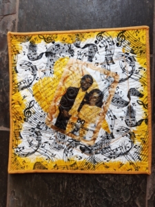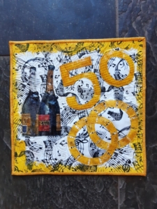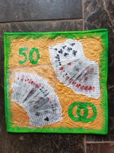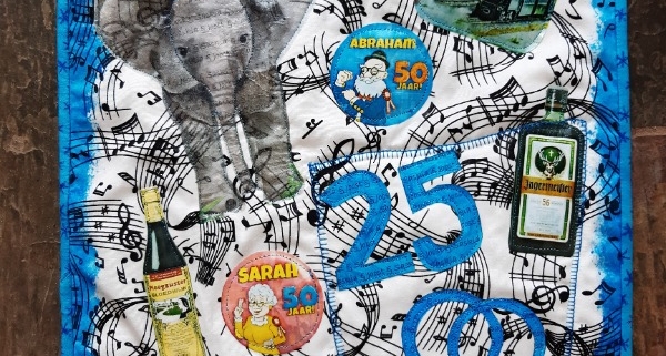 Om toch een soort van overzicht te houden op mijn wips (work in progress) en ufo’s (unfinished objects), maak ik ieder jaar een lijstje met quilts die ik dat jaar wil afmaken, maar ook beginnen. Of technieken waar ik iets mee wil doen. Soms kan ik zoiets combineren. Het afgelopen jaar wilde ik ook meer met gelmedium en papier werken. Er waren toevallig een aantal huwelijksjubilea in de familie en bij de vrienden, dus heb ik daar een paar quiltjes voor gemaakt, waar ik dan bijvoorbeeld de trouwkaart in verwerkte. Of foto’s of zoiets.