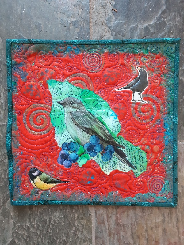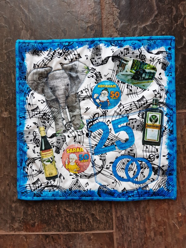 Om toch een soort van overzicht te houden op mijn wips (work in progress) en ufo’s (unfinished objects), maak ik ieder jaar een lijstje met quilts die ik dat jaar wil afmaken, maar ook beginnen. Of technieken waar ik iets mee wil doen. Soms kan ik zoiets combineren. Het afgelopen jaar wilde ik ook meer met gelmedium en papier werken. Er waren toevallig een aantal huwelijksjubilea in de familie en bij de vrienden, dus heb ik daar een paar quiltjes voor gemaakt, waar ik dan bijvoorbeeld de trouwkaart in verwerkte. Of foto’s of zoiets.