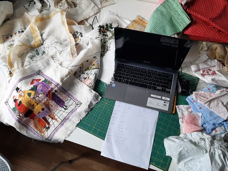 Mijn moeder van 93 heeft haar hele leven gehandwerkt en kleertjes voor ons genaaid. Ze is kleiner gaan wonen en bij het verhuizen kwamen we dat allemaal tegen. Ik heb al het borduurwerk uit de lijsten gehaald en alles gewassen en nu is het de bedoeling dat ik daar iets van ga maken. Ik heb de maten opgemeten en ben nu bezig om dat op schaal in te voeren. Een hele leuke puzzel.