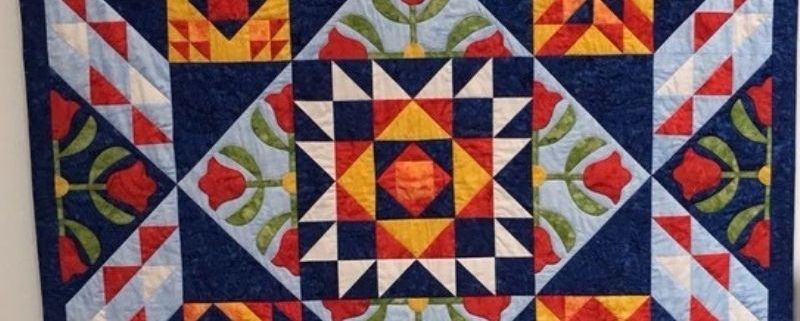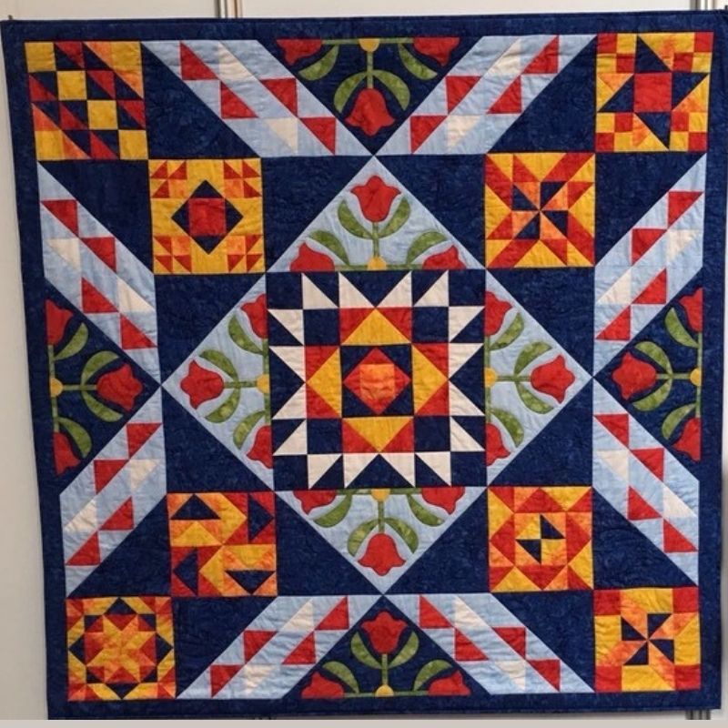 In 2016 heb ik de cursus ‘Tulpen en Tegels’ gevolgd bij Marjolein van der Eijk, omdat ik graag wilde leren hoe je met de naaimachine werkt. Het resultaat was een heel fleurige quilt waar ik erg blij mee was. Mijn kleinzoon Jaimy (toen 6 jaar) was altijd er geïnteresseerd als ik met lapjes aan het werk was en vond de losse blokken met rood, oranje en geel al erg mooi. Hij wilde graag dat ik de quilt voor hem zou maken maar dan wel ‘meer blauw oma’. Hij werd op zijn wenken bediend!