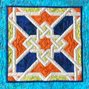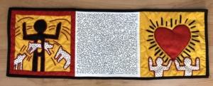 Ik houd van vrolijke kleuren, geometrische patronen en redelijk strakke lijnen. Het meest sluit dat aan bij de moderne quilt. Maar ik vind het ook leuk om een eigen draai te geven aan bestaande afbeeldingen. Bv een miniquiltje naar aanleiding van een tentoonstelling over Keith Haring (foto links) of een quiltuitwerking van een Arabische tegel (foto rechts) naar aanleiding van een cursus die ik volgde over Islamitische kunst.