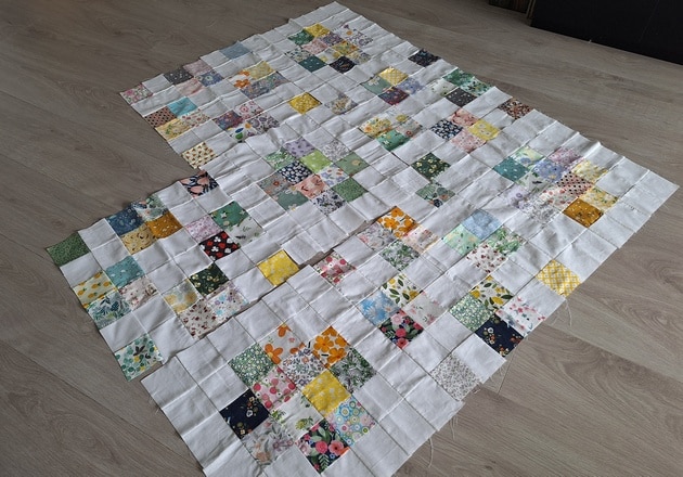 Vorig jaar kreeg ik op mijn verjaardag een doosje met 198 bloemetjesblokken van 9,5 cm vierkant. Ik had zelf nog een grote lap lichte stof. De bloemetjesstof wilde ik zo groot mogelijk houden en vulde deze aan met lichte blokken. Dit soort naaiwerk doe ik vaak op de Bee. Dan is een scrapquilt een favoriet van me. Dat gaat altijd goed en kan je combineren met gezellige (en soms serieuze) gesprekken.
