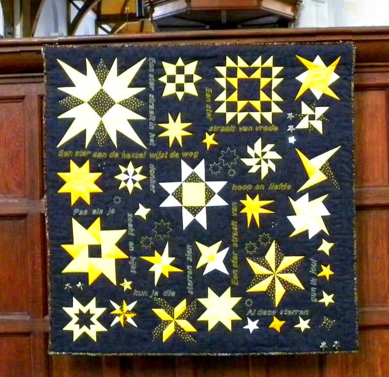 In de gang hangt deze quilt die ik in 2012 maakte. Die blijft daar, daar kijk ik nog altijd met plezier naar. Gewoon willekeurig blokken gekozen van Birdblocks, daarna geschikt tot een quilt. Ik vond het daarna nog wat saai. Toen heb ik tekst gezocht om op de tussenbanen te borduren. Hier en daar nog een paar goudkleurige pailletten en metalen sterren maakte het af.