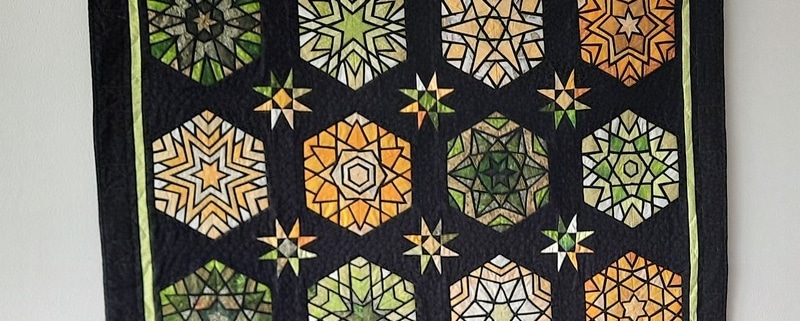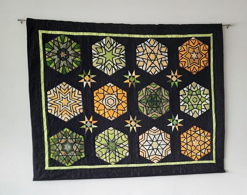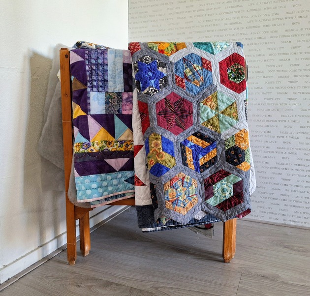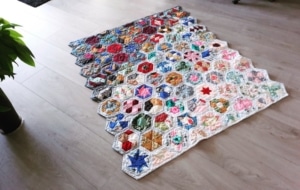 Toen ik 65 werd en met pensioen ging, vroeg ik aan iedere gast om een lapje te geven dat ze zelf mooi vonden en niet te denken aan wat ik mooi zou vinden. Dat werd een bonte verzameling natuurlijk. Daar maakte ik de quilt hierboven op de foto van. De band die ik heb met al deze mensen zie je terug in de 3 tinten grijs waarmee ik alle hexagonnen aan elkaar gezet heb. Het waren de hexagonnen van Katja Marek.