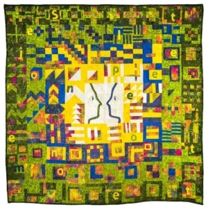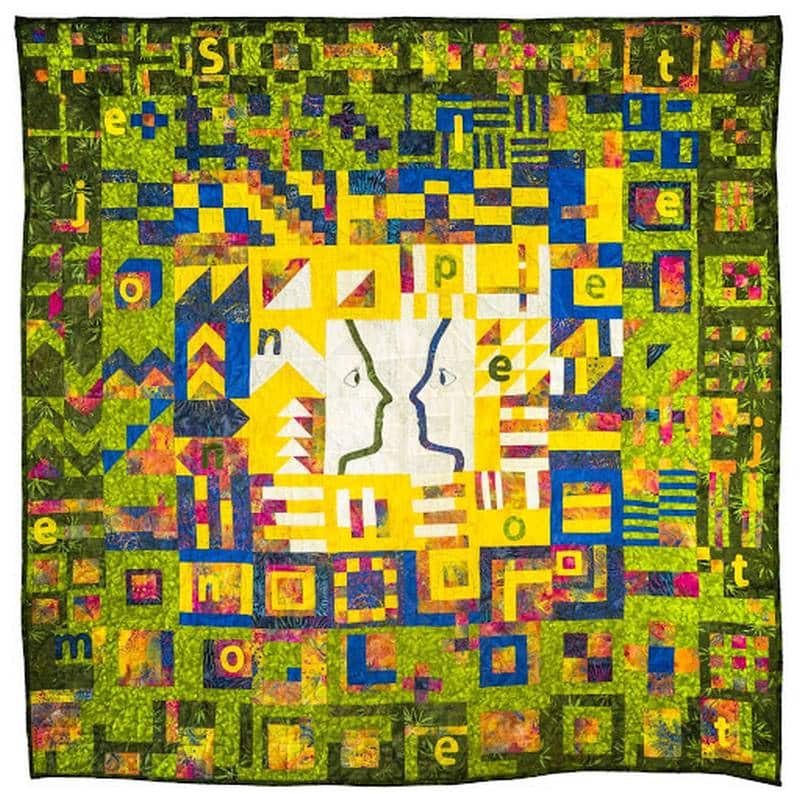 In 2019 kwam vanuit het Quiltersgilde een oproep op Facebook om in 100 dagen de 100 blokken van Tula Pink in omgekeerde volgorde te maken. Dat vond ik wel een uitdaging. De blokken leken me niet zo ingewikkeld en dacht ik, ik kan wel eens proberen op de naaimachine te patchen. Dat hield ik maar plm. 30 blokken vol. Een dag in de week de naaimachine op de eettafel en dan meer blokken tegelijk maken, daar voelde ik stress van. Elke dag een blokje met de hand, dat lukt wel en werkt ontspannend. Begin 2020 was de quilt klaar. Als quiltpatroon koos ik het logo van Facebook en de S van Social Media. Ik noemde hem “uitnodiging tot ontmoeting” en als je goed kijkt zie je in de quilt geappliqueerde letters, een oproep. Twee gezichten in het midden kijken elkaar aan.