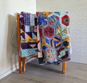 Het liefst werk ik aan 2 quilts tegelijk, een om te patchen en een om te quilten. Meer projecten tegelijk maken me onrustig. Ik maak ook geen standaard quilts, vind ik. Een vast patroon, of een hele quilt met dezelfde blokken heeft niet mijn voorkeur.