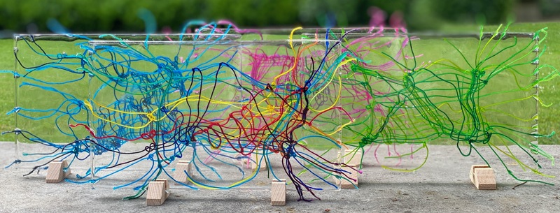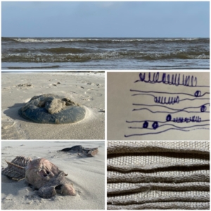 Tijdens de Corona pandemie heb ik tijd over en begin ik na te denken om mijn werk van a tot z zelf te maken en zo komt weven op mijn pad. Via marktplaats weet ik een spinnenwiel op de kop te tikken en in de kringloop staat zielig ergens in een hoekje een weefgetouw. Nou dat heb ik geweten. Spinnen en weven onder de knie krijgen is een helse klus, maar inmiddels ben ik zover dat ik mijn eigen lappen weef. Op dit moment ben ik bezig met een werk dat is geïnspireerd op de zee. Ik gebruik de zogenaamde dubbelweef techniek en zo ontstaan onder mijn handen golven. Zodra de lap van het weefgetouw is, ga ik verder met verven, punchen en borduren en zo kom ik weer aan de meerdere lagen van een quilt. Voorlopig is het werk nog niet af en waar het mij uiteindelijk naar toe brengt, is nog een vraag. Ga ik de kant op van vluchtelingen op zee, of blijf ik heel simpel gewoon bij de zee die van alles meevoert naar het strand, zoals schelpen, kwallen, krabben, maar helaas ook afval.
