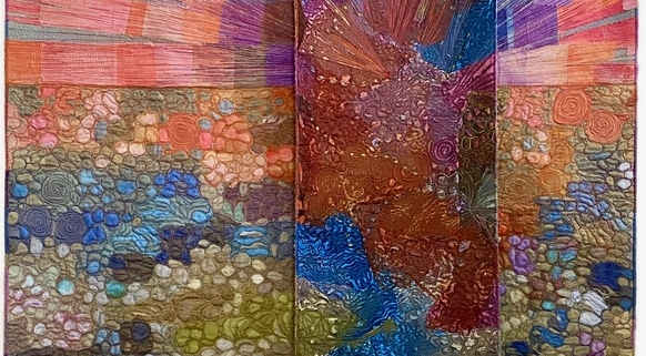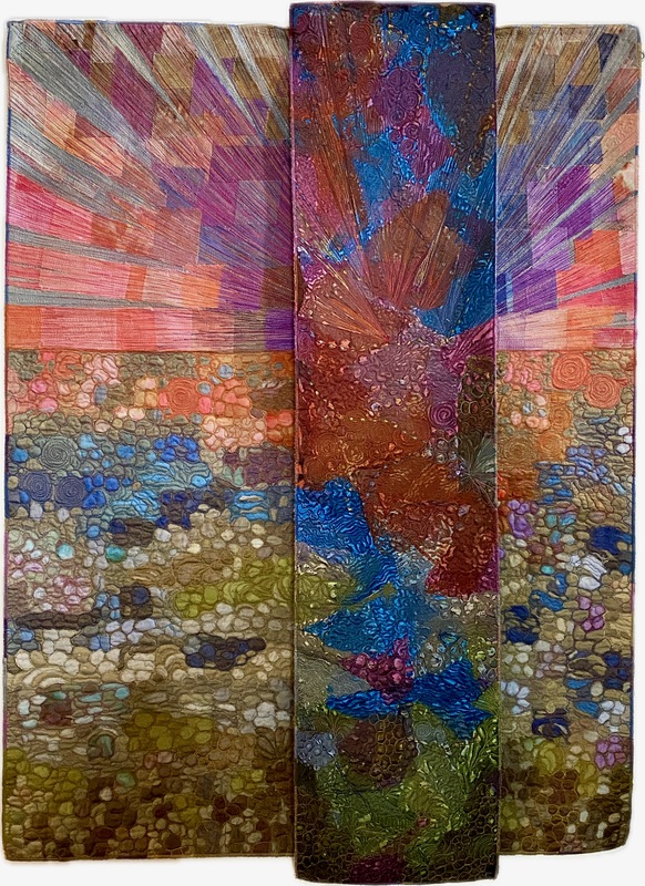 Eigenlijk heb ik twee favoriete quilts. Mijn allereerste echte art-quilt ‘De kringloop van het Wad’ Het vertolkt de kringloop van eb en vloed en zonsopgang en zonsondergang.