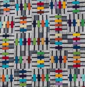 De laatste quilt die ik gemaakt heb, is een vrij grote quilt met kleuren. Ik wilde uitproberen hoe kleuren op elkaar inwerken met grijs en zwart/wit tinten. Zelfs de wat ‘saaie’ kleuren komen er goed in uit. De quilt hangt in de kamer en de kleinkinderen noemen het de vlaggenquilt.