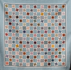 Toen ik 50 werd, heb ik aan alle mensen een fat quarter gevraagd met speciaal verzoek iets uit te zoeken wat zíj mooi vonden. Dat leverde mooie verhalen op! Een schoonzusje uit Groningen kwam indertijd nietsvermoedend terecht in de ‘Naaidoos” in Nieuw-Buinen. Ze werd overweldigd door de hoeveelheid en de gevarieerdheid van de lapjes. Ze vertelde dat ze er 3 uur had rondgelopen. Vriendinnen – geen quiltsters – kwamen in de toenmalige quiltwinkel in Hoorn. De verkoopster vroeg aan de 2de of het een kadootje was voor de mevrouw die 50 ging worden…Zo ja, dat kon ze beter een ander lapje kopen want diezelfde ochtend had iemand anders dat lapje al uitgezocht. Ik kon vaak aan de lapjes herkennen wie het gekocht had! Zo was er o.a. een lapje met blauwe roosjes dat Roos had gekocht en een lapje met kleurige bloemen van een vriendin, die schildert. Van ieder lapje maakte ik een ster. Het werd een gepuzzel om er iets van een compositie in te krijgen, maar het is aardig gelukt. Een aantal mensen is inmiddels overleden en dat maakt de quilt nog dierbaarder.