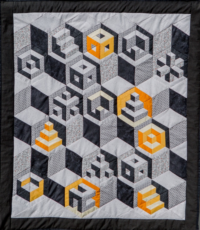 En met onze bee, een 3d quiltje in zwart, grijs en okertinten.