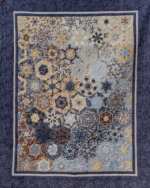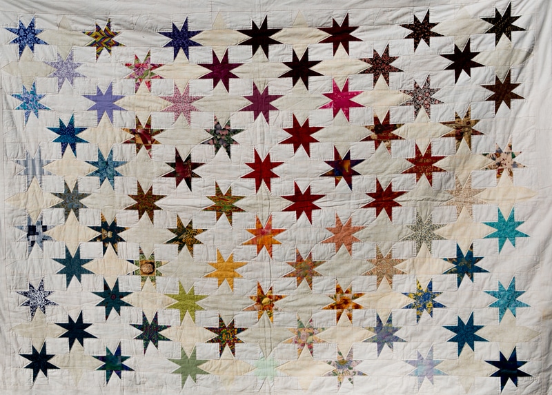 Toen ik 50 werd, heb ik aan alle mensen een fat quarter gevraagd met speciaal verzoek iets uit te zoeken wat zíj mooi vonden. Dat leverde mooie verhalen op! Een schoonzusje uit Groningen kwam indertijd nietsvermoedend terecht in de ‘Naaidoos” in Nieuw-Buinen. Ze werd overweldigd door de hoeveelheid en de gevarieerdheid van de lapjes. Ze vertelde dat ze er 3 uur had rondgelopen. Vriendinnen – geen quiltsters – kwamen in de toenmalige quiltwinkel in Hoorn. De verkoopster vroeg aan de 2de of het een kadootje was voor de mevrouw die 50 ging worden…Zo ja, dat kon ze beter een ander lapje kopen want diezelfde ochtend had iemand anders dat lapje al uitgezocht. Ik kon vaak aan de lapjes herkennen wie het gekocht had! Zo was er o.a. een lapje met blauwe roosjes dat Roos had gekocht en een lapje met kleurige bloemen van een vriendin, die schildert. Van ieder lapje maakte ik een ster. Het werd een gepuzzel om er iets van een compositie in te krijgen, maar het is aardig gelukt. Een aantal mensen is inmiddels overleden en dat maakt de quilt nog dierbaarder.