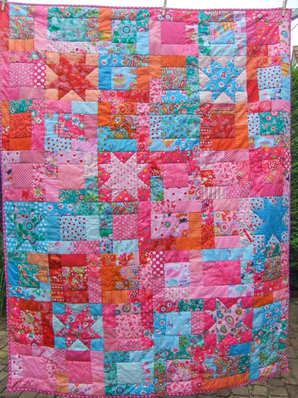 In Coronatijd heb ik van alle ‘ouwe meuk’ lapjes die ik in de kast had liggen een quilt gemaakt. ‘Ouwe meuk’, de restanten van lapjes die er al jaren lagen vanaf mijn beginjaren en waarvan ik zeker wist dat ik ze nooit meer zou gebruiken. De nieuwe restjes die daardoor weer ontstonden, mochten niet meer terug in de kast….