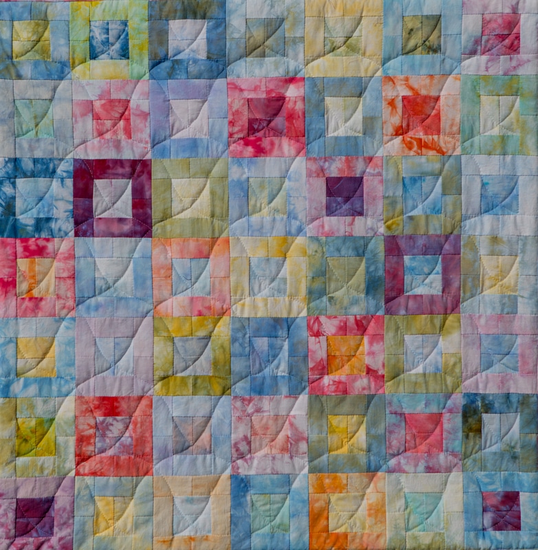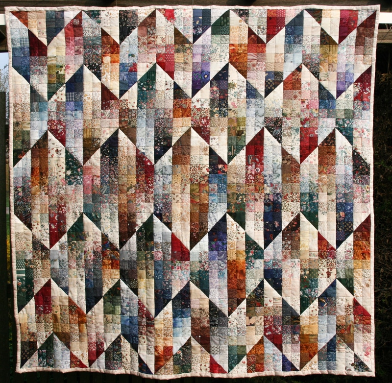 Een one blockwonder-quilt, die op de tentoonstelling in Alkmaar heeft gehangen.