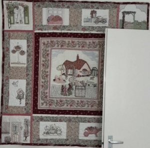 Na de verhuizing heb ik eindelijk alle spullen weer op zijn plaats en kwam ik alle geborduurde onderdelen van de English Country garden borduur quilt weer tegen. Met veel plezier heb ik tijdens de corona periode alle onderdelen geborduurd. Maar ja, dan komt het in elkaar zetten van de onderdelen. Dat is nu niet bepaald mijn ding. Toch heb ik besloten om het af te maken, dan maar met scheve hoek. We hebben de quilt zo opgehangen dat wanneer de deur open staat de scheve hoek achter de deur zit. 😉