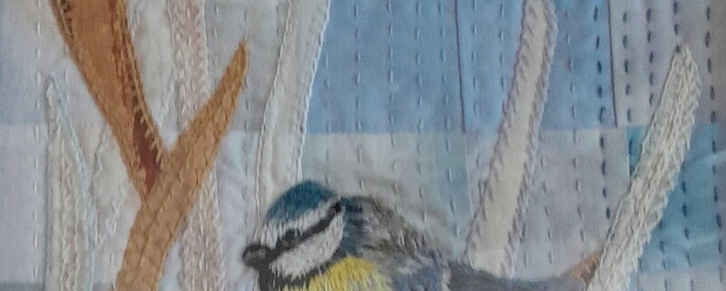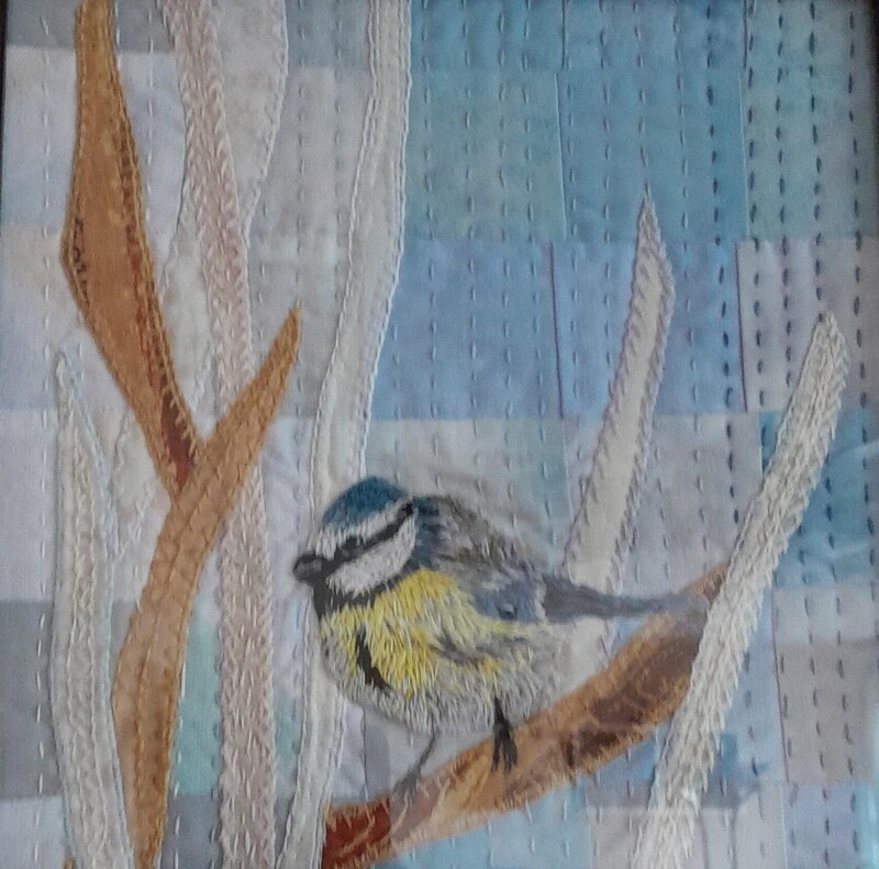 Het kleine quiltje van het meesje van de uitgelichte afbeelding is een ook zo’n probeersel. Vogeltje is geborduurd op een klein lapje waar ik soluvlies op heb geplakt, toen het vogeltje erop getekend en daarna geborduurd en soluvlies weggespoeld. Toen was het vogeltje klaar en wat moet je er dan mee. Dus wat takken gemaakt en een achtergrond met blokjes van 4×4, lapjes van oude overhemden van mijn man en die weer doorgeregen met verschillende kleuren blauw borduurgaren.