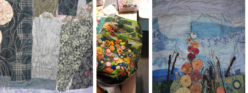 Ik ben nu een restjes quilt aan het maken. Daarvoor heb ik eerst een ondergrond gemaakt door allerlei restjes en strookjes op een stuk stof te leggen, daar tule overheen gelegd en dit met de naaimachine vastgenaaid met freemotion steken. Daarna heb ik rondjes met de jojomaker gemaakt of van allerlei restjes stof rondjes en blaadjes voorbereid. Deze ben ik op de ondergrond aan het appliqueren en heb ik de hartjes van de rondjes weer voorzien van kraaltjes. Omdat ik zo van borduren hou, vul ik de overblijvende ruimtes op met borduursteken. Daarvoor heb ik eigenlijk een rare manier van borduren. Ik grijp in de bak met draadjes en met welk klosje of draadje ik dan in de hand heb, borduur ik ergens op de lap waar het draadje voor mijn gevoel het beste past en met een steek die me geschikt lijkt op die plek.