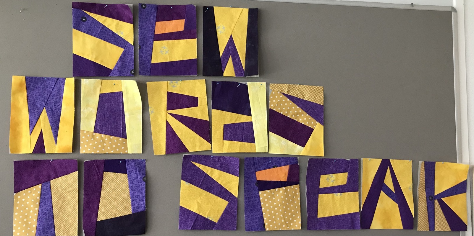Op dit moment maak ik een moderne quilt waarin een tekst verwerkt wordt. De uitdaging is slechts 2 kleuren te gebruiken die complementair zijn.
