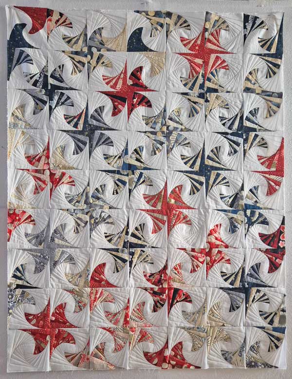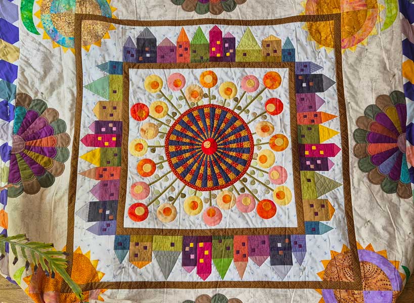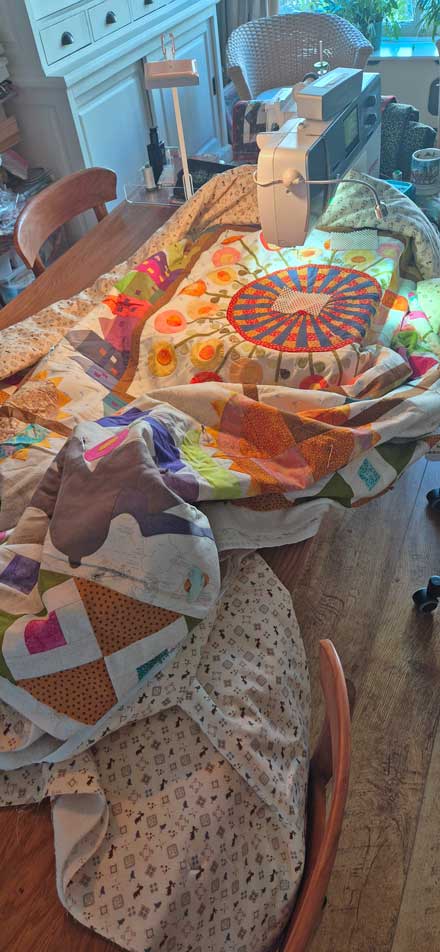 Ik heb nog een lange weg te gaan, maar de eerste steen is dus gelegd. De kop is eraf. Ik had al weer veel verder willen zijn, maar moest alles in de wacht zetten vanwege een verbouwing. Ik wilde zeker weten dat al het bouwstof uit de lucht was voor ik met die enorme lap half over tafel, deels op de vloer weer ging slepen. Eén ding is duidelijk: het doorquilten van zo’n grote sandwich is erg goed voor het opbouwen van de schouderspieren en bovenarmen. Ik kijk er naar uit om jullie volgende keer meer voortgang te kunnen laten zien.