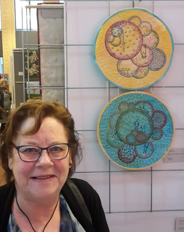Op deze foto zie je Eike op een Tentoonstelling voor Miniatuurquilts in Apeldoorn in 2018, voor 2 van haar quiltjes.