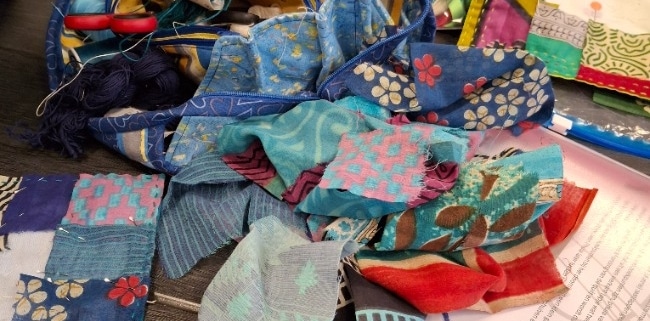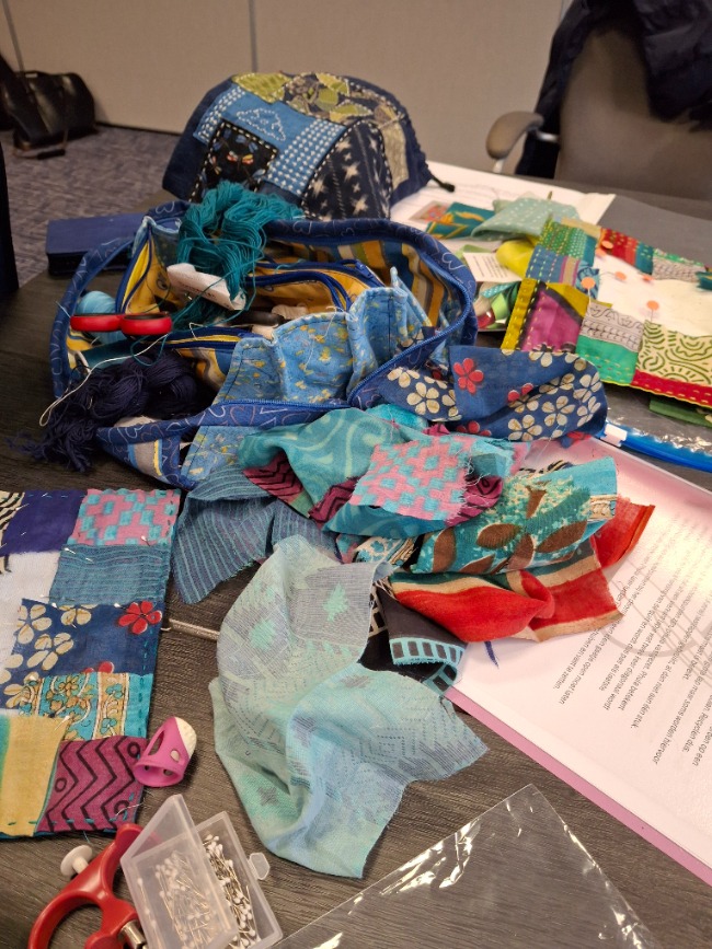 Zodra december in beeld komt zetten we alle zeilen bij om alles op tijd af te krijgen. Het einde van het jaar betekent goed plannen om alles wat we moeten en willen doen ook voor elkaar te krijgen. De jaarrekening wordt gemaakt, de begroting voor de komende jaren. De penningmeester is er druk mee. Dan bespreken we met het bestuur de eerste opzet van het beleidsplan voor de komende periode wat weer wijzigingen op de begroting kan betekenen. Een heel gepuzzel om dat kloppend en voor elkaar te krijgen. Ook de afhandeling van de regiodagen wordt gedaan, met de commissies worden de plannen voor volgend jaar besproken, de voorbereidingen voor de tentoonstellingen in februari in Rijswijk, Vicenza en Amersfoort worden geregeld en projecten voor 2026 in gang gezet. En dat is dan alleen (een deel) van de ‘zakelijke’ taken. Eind november hebben we als bestuur 2 dagen met elkaar overlegd over de stand van zaken en de toekomst van de vereniging. We hebben genoeg plannen en zijn gelukkig financieel gezond maar de terugloop van het aantal leden noopt tot aanpassingen. Tijdens de Algemene Ledenvergadering in maart 2026 komen we daar uitgebreid op terug. Na een hele dag vergaderen en de hersenen laten kraken, was het ’s avonds tijd voor ontspanning. Onze handen zijn graag bezig dus gingen we aan de slag met onze lapjes en draadjes.