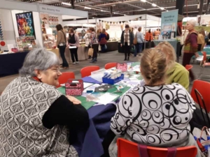 Ook ditmaal kregen we naast de inzet van onze bestuursleden weer geweldige hulp van enthousiaste vrijwilligers. Samen zorgden we ervoor dat zowel de infostand als de make & take tafel op rolletjes liep! Voor de make & take tafel waren drie leuke werkjes in handige kant-en-klare pakketjes voorbereid. Bezoekers konden kiezen uit het maken van een leuke duimmuis, een handig naaldenmapje of een Wonderfil-pakketje Fix & Flair, visible mending. De keuze was soms lastig, want elk project had zijn eigen charme!
