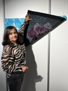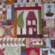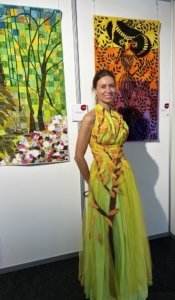 Zij gebruikt mixed media voor haar werk, patchwork, quilten en bedrukken met zelfgemaakte houtsneden. De kleuren spraken mij bijzonder aan, felgeel, neongroen e.d.