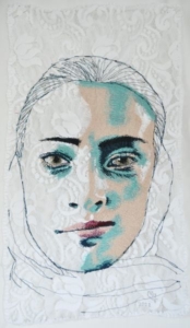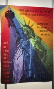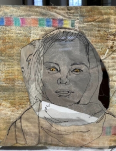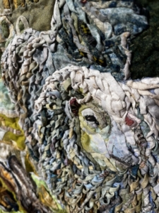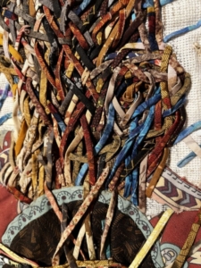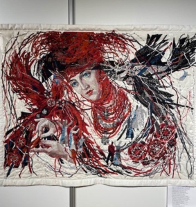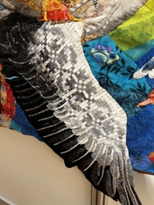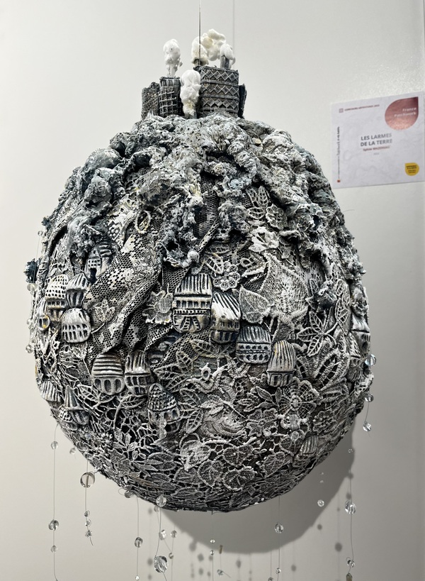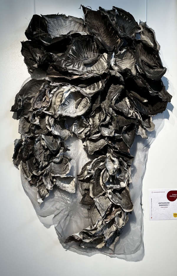 Een tentoonstelling van het Franse ‘quiltersgilde’, France Patchwork. Hier was een aantal interessante werken bij met bijzondere technieken: bv ‘quilts’ die bestonden uit dun plastic waarop ‘draden’ waren gemaakt met lijm. En een aantal 3D werken die ik interessant vond.