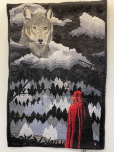 De wedstrijdquilts. Uit de beschrijving van het thema ( Frans en Engels) hadden wij gehaald dat het om sprookjes ging. Het bleek dat ook een herinnering uit je kindertijd als inspiratie kon dienen. ( En wij maar trachten te bedenken om welk sprookje het ging. ) De winnaars werden pas vrijdag bekend gemaakt.