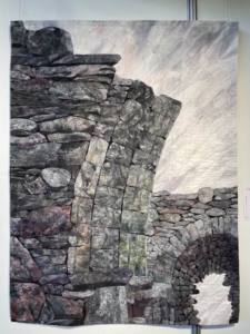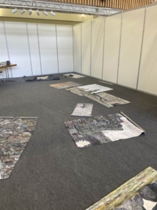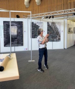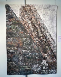 De expositie van onze Amerikaanse vriendin. Voor haar Stenen beschildert zij stof met behulp van allerlei technieken.