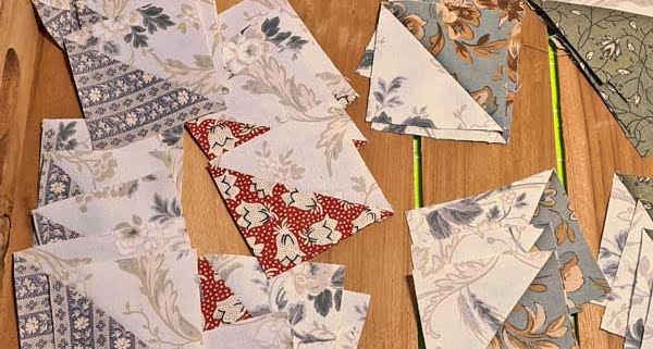 Zo’n snelle driehoek is dan wel weer zo gemaakt, maar de blokjes zitten nog niet aan elkaar. Het placematje is nog niet af. Nee. Want ik moest eerst nog even dit blogje voor jullie klaarzetten ;-). Dus deze keer is het allemaal een tandje minder, maar gelukkig ben ik wel weer een beetje op stoom.